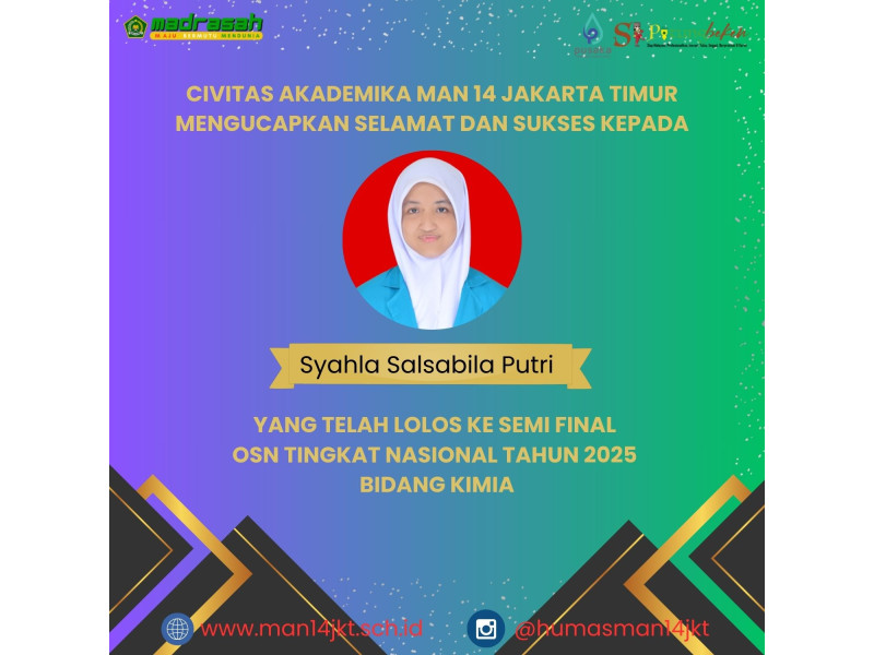 108 04 Sep 2025Jakarta (Humas MAN 14 Jakarta) – Syahla Salsabila Putri peserta didik Madrasah Aliyah Negeri (MAN) 14 Jakarta berhasil masuk tahap semifinal tingkat provinsi DKI Jakarta pada Olimpiade Sains Nasional (OSN) 2025 bidang Kimia.Olimpiade Sains Nasional (OSN) adalah sebuah ajang talenta di bidang sains yang diselenggarakan
